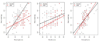 Scatter plot and regression line between body weight and body measurements of female and male Saburai goats at age 0 month (at birth).