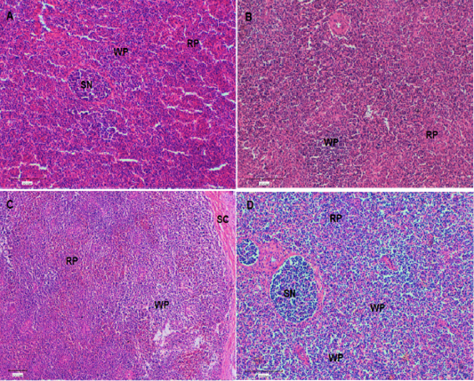 (A). Spleen of control chickens on day 42 showing normal splenic histology and architecture. In addition, different types of red pulp and white pulp were easily visible. (B). Spleen of challenged chickens with sheep erythrocytes (SRBC) on day 42 showing decrease of red pulp with a few white pulp. (C). Spleen of chickens challenged with SRBC post-treatment with Lycium shawii on day 42 showing mild increase in white pulp. (D). Spleen of chickens challenged with SRBC post-treatment with R.epapposum on day 42 showing sever increase in white pulp and condensation of lymphocytes. Differentially types of splenic nodules were easily visible. HandE (X40). RP: red pulp; WP: white pulp, SN: splenic nodule; Sc: splenic capsule.