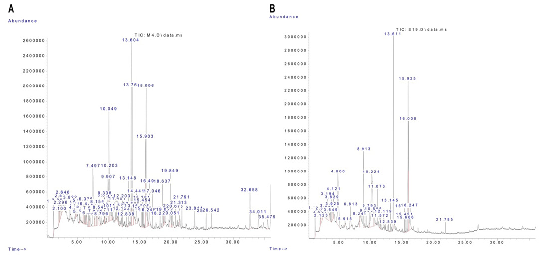 Chromatogram of the methanolic extract of R. epapposum (A) and Lycium shawii (B).