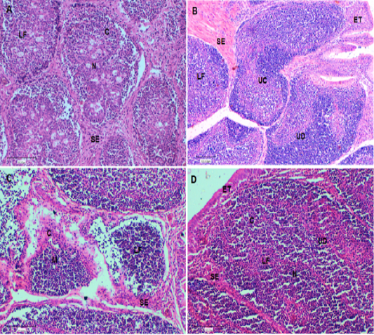 (A). Bursa of control chickens on day 42 showing lymphoid follicles with scattered evacuation and medium condensation of lymphocytes in cortical regions. The demarcation between cortex and medulla was disappeared. (B). Bursa of challenged chickens with sheep erythrocytes (SRBC) on day 42 showing depletion of medulla from lymphocytes with smaller lymphoid follicles. (C). Bursa of chickens challenged with SRBC post-treatment with Lycium shawii showing depletion of cortex from lymphocytes with large empty spaces. (D). Bursa of chickens challenged with SRBC post-treatment with R. epapposum showing condensation of cortex with lymphocytes and medulla with extensive population of lymphocytes with clear demarcation between them. H and E (X40). SI: Space interfollicular, C: Cortex, M: Medulla, LF: Lymphoid Follicle, ET: Epithelial Tissues, UC: Undifferentiated Cells, BC: Blood capillaries.