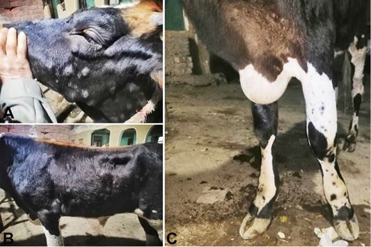 Clinical sings of LSD, A. Cutaneous nodules on the head and neck regions, B. lumps on different body regions with enlargement of superficial lymph nodes. C. Edema in the dewlap and fore limb