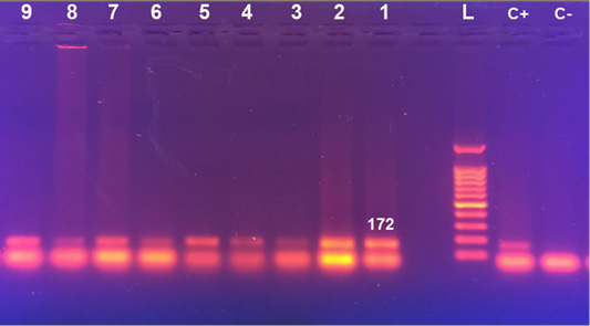 C-: control negative, C+: control positive, L: 100bp DNA ladder, Lane 1:9: naturally LSDV infected calves samples