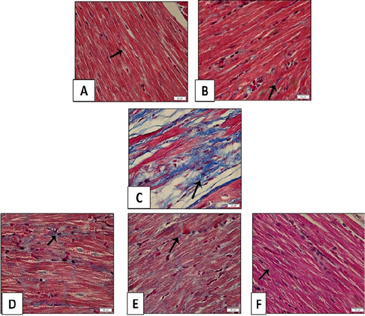 Histopathological examination of transverse sections of Masson trichrome stained heart in isoprenaline-induced CHF in rats (x400) (curative). A: Control group illustrating few collagen fibers in-between the muscle fibers. B: Treatment with (sage oil 50 mg/kg /day/p.o) alone showing minimal collagen fibers. C: CHF group received isoprenaline (85mg/kg/day/sc for 2 consecutive days and kept for 2 weeks for induction of heart failure demonstrating widespread of collagen fibers. D, E: CHF rats treated with sage oil (50mg/kg/day/p.o) and digoxin (1mg/kg/day/p.o) for 2 weeks after induction of heart failure to CHF rats separately showing partially attenuated myocardial fibrosis. F: Myocardial section of CHF rats treated with combination of sage oil and digoxin at dose of (50 and 0.5) mg/kg /day/p.o respectively for 2 weeks after induction of heart failure respectively demonstrating greatly alleviated myocardial fibrosis.