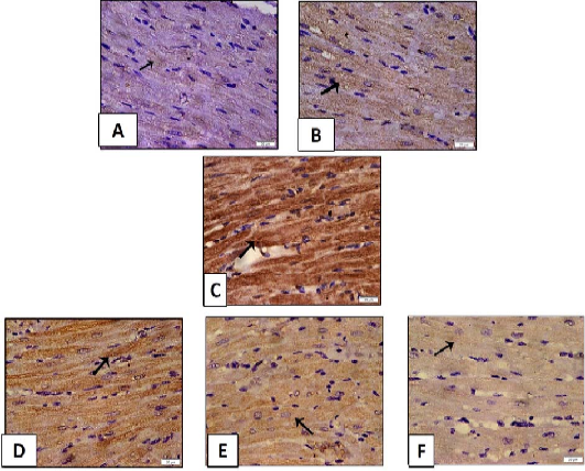 A: Control group illustrating minimal positive cytoplasmic immunoreaction in muscle fibers. B: Myocardial section of rats received (sage oil 50mg/kg/day/p.o alone) showing positive caspase 3 immunoreaction which is almost comparable to control. C: Myocardial section of CHF rats received isoprenaline (85mg/kg/day sc for 2 consecutive days and kept for 2 weeks for induction of heart failure) showing strong extensive positive immunoreaction. D, E: Myocardial section of CHF rats treated with sage oil (50mg/kg/day/p.o) and digoxin (1mg/kg/day/p.o) separately showing decreased intensity of immunoreaction. F: Myocardial section of CHF rats treated with combination of sage oil and digoxin at dose of (50 and 0.5) mg/kg /day/p.o respectively for 2 weeks after induction of heart failure respectively demonstrating positive immunoreaction that is nearly similar to that of control group.