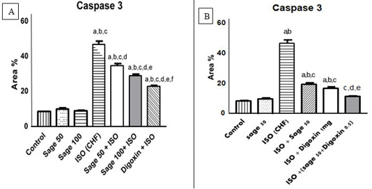 Quantification of the effect of sage oil on cardiac caspase 3 immunoreaction in isoprenaline-induced CHF in rats; A) prophylactic; B) curative.