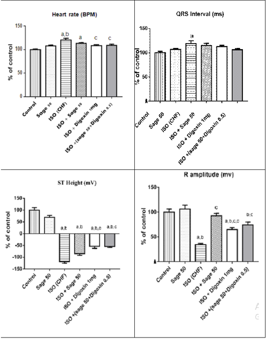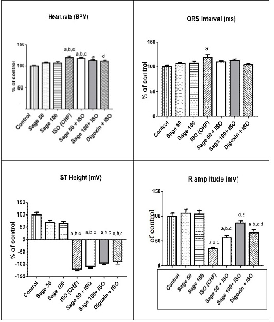 Effect of sage oil on ECG parameters in isoprenaline-induced CHF in rats (curative). Data was expressed as mean ± SE, n= 5. a,b,c,d or e significantly different from the control, sage oil 50mg, ISO group, ISO+sage oil 50, ISO+Digotoxin 1 mg, ISO+ (sage oil 50+Digotoxin 0.5) at (P<0.0).