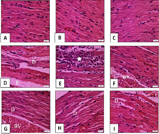 A: Normal rats showing normal histological architecture. The muscle fibers appear as branched fibers with central oval nuclei (arrow). B and C: Myocardial section of rats received sage oil (50mg and 100 mg/kg/day/p.o alone) illustrating normal histological structure. D, E, F: Myocardial section of CHF rats received isoprenaline (85mg/kg/day sc for 2 consecutive days and kept for 2 weeks for induction of heart failure) showing myocardial degeneration and necrosis (D) with interstitial edema (E). Inflammatory cell infiltration (star) and dilated blood vessel (BV) can be seen. G,H,I: Myocardial section of rats received sage oil (50mg, 100mg/kg/day/p.o) or digoxin (1mg/kg/day/p.o) 1 week before isoprenaline and continued for 2 weeks still revealed myocardial alterations [myocardial degeneration (D) and dilated blood vessels (BV)].