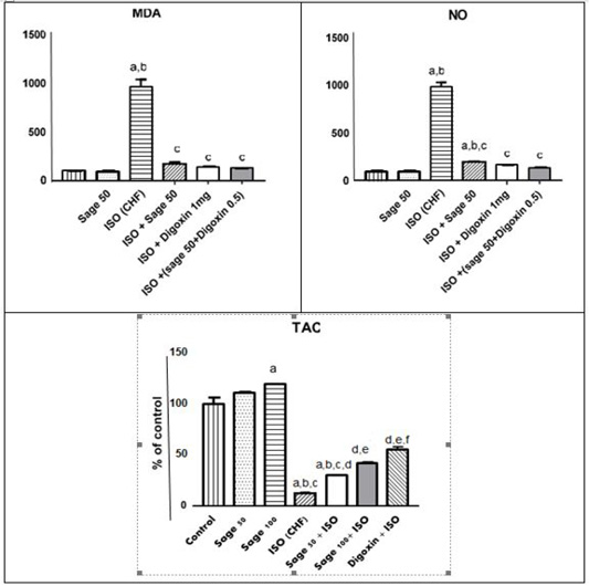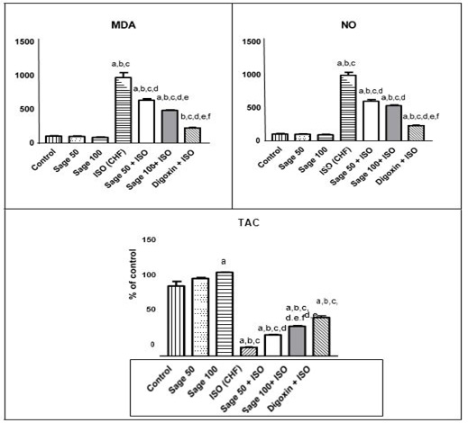 Effect of sage oil on cardiac oxidative stress and antioxidant markers in isoprenaline-induced CHF in rats (curative). Data was expressed as mean ± SE, n= 5, a, b, c, d or e significantly different from the control, sage oil 50mg, ISO group, ISO+ sage oil 50, ISO+ Digotoxin 1 mg, ISO+ (sage oil 50+Digotoxin 0.5) at (P<0.05).