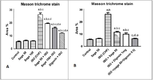 Quantification of the effect of sage oil on cardiac collagen fibers stained with Masson trichrome in isoprenaline-induced CHF in rats. A) prophylactic B) curative, 10 x fields were averaged across 10 fields for each rat section. Data was expressed as mean ± SE, n= 5, a, b, c, d, e or f: Significantly different from the control, sage oil 50mg, sage oil 100mg, ISO (CHF), prophylactic sage oil 50mg+ ISO or prophylactic sage oil 100mg+ ISO respectively at (P<0.05).