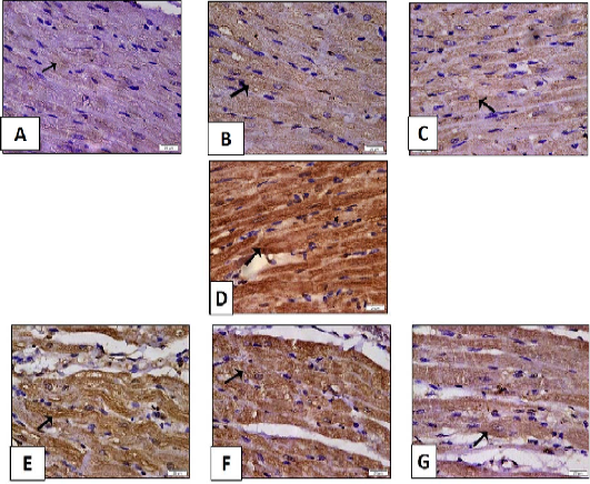 A: Control group illustrating minimal positive brown cytoplasmic immunoreaction in muscle fibers. B, C: Myocardial section of rats received sage oil (50mg or 100 mg/kg/day/p.o alone) showing positive caspase 3 immunoreaction which is almost comparable to control. D: Myocardial section of CHF rats received isoprenaline (85mg/kg/day sc for 2 consecutive days and kept for 2 weeks for induction of heart failure) showing strong extensive positive immunoreaction. E, F, and G: Myocardial section of rats received sage oil (50mg, 100mg/kg/day/p.o) or digoxin (1mg/kg/day/p.o) 1 week before isoprenaline and continued for 2 weeks respectively illustrating moderate positive cytoplasmic immunoreaction for caspase 3.