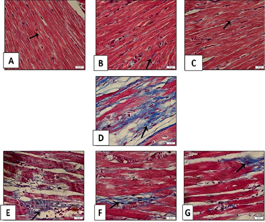Histopathological examination of transverse sections of Masson trichrome stained heart in isoprenaline-induced CHF in rats (x400) (prophylactic).A: Control group illustrating few collagen fibers in-between the muscle fibers. B,C: Treatment with sage oil (50 or 100) mg/kg/day/p.o) alone showing minimal collagen fibers.D: CHF group received isoprenaline (85mg/kg/day/sc for 2 consecutive days and kept for 2 weeks for induction of heart failure demonstrating widespread of collagen fibers.E,F,G: Myocardial sections of rats received sage oil (50mg, 100mg/kg/day/p.o) or digoxin (1mg/kg/day/p.o) 1 week before isoprenaline and continued for 2 weeks respectively illustrating moderate amount of collagen fibers.