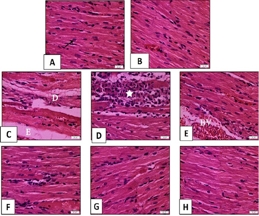 A: Normal rats showing normal histological architecture. The muscle fibers appear as branched fibers with central oval nuclei (arrow). B: Myocardial section of rats received sage oil (50mg/kg/day/p.o alone) illustrating normal histological structure. C, D, E: Myocardial section of CHF rats received Isoprenaline (85mg/kg/day sc for 2 consecutive days and kept for 2 weeks for induction of heart failure) showing myocardial degeneration and necrosis (D) with interstitial edema (E). Inflammatory cell infiltration (star) and dilated blood vessel (BV) can be seen in F,G: Myocardial section of CHF rats treated with sage oil (50mg/kg/day/p.o) and digoxin (1mg/kg/day/p.o) separately for 2 weeks after induction of heart failure respectively showing partial improvement. H: Myocardial section of CHF rats treated with combination of sage oil and digoxin at a dose of (50 and 0.5) mg/kg /day/p.o respectively for 2 weeks respectively after induction of heart failure demonstrating almost preserved the normal myocardial architecture.