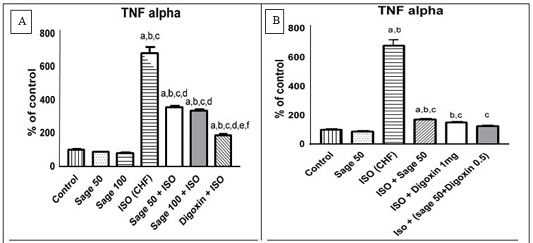Effect of sage oil on serum inflammatory marker (TNF-α) level in isoprenaline- induced CHF in rats. A) prophylactic, B) curative.