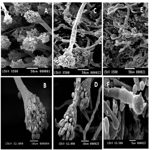 SEM images for A. fumigatus (A, B): normal, (C, D): effect of TN at 4%; (E, F): effect of CN at 4% on A. fumigatus