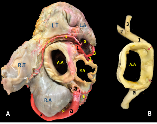 The cardiac base of donkey heart showing A) the origin and directions of the coronary arteries and B) the position of the right and left coronary ostia inside the aorta.