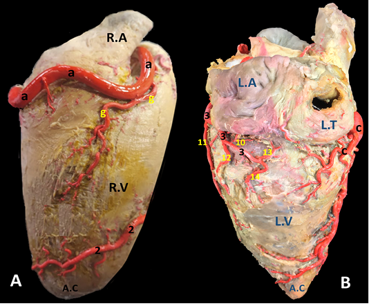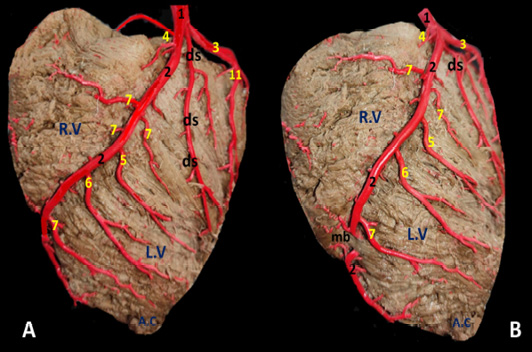 A) Margo ventricularis dexter and B) Margo ventricularis sinister of the donkey heart showing the distribution of coronary arteries.