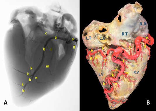A) A radiograph and B) latex injection of donkey heart showing the distribution of the right coronary artery and its branches on the atrial surface.