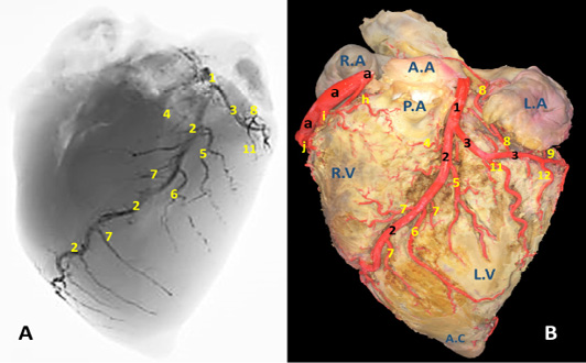 A) A radiograph and B) latex injection of donkey heart showing the distribution of the left coronary artery and its branches on the auricular surface.