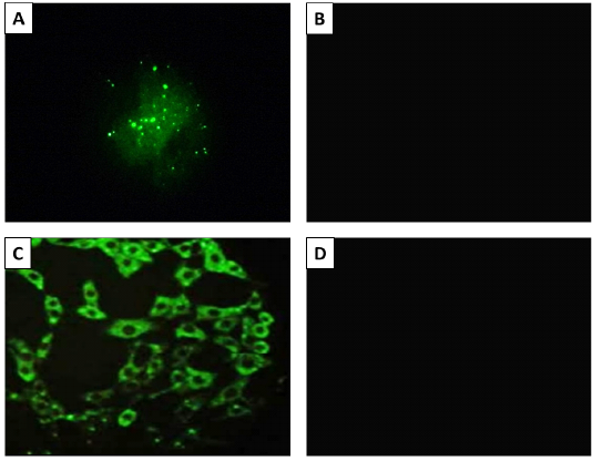 The result of fluorescent antibody technique (FAT) Panel A; Positive (bright green apple fluorescence) on brain impression smear. Panel B; Negative control sample, Panel C; Positive fluorescence on BHK-21 cells inoculated with Rabies virus. Panel B; Negative control (uninfected cells). 400X magnification.