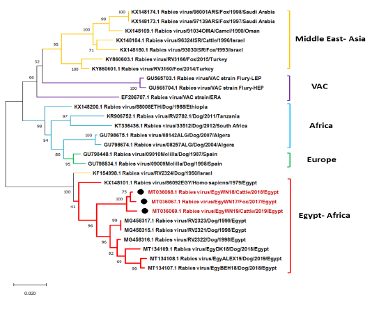 Phylogenetic tree using maximum likelihood method based on phosphoprotein (P) gene nucleotide sequences of our new RABV isolates from Elwadi- Elgedid (indicated by black circles) with other sequences of rabies viruses retrieved from the GenBank database. Numbers at the internal nodes represent the bootstrap probabilities (1000 replicates). The scale bar (0.02) means nucleotide changes or substitutions per site.