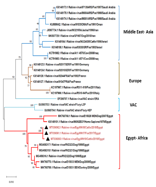 Phylogenetic tree using maximum likelihood method based on glycoprotein (G) gene nucleotide sequences of our new RABV isolates from Elwadi- Elgedid (indicated by black triangles) with other sequences of rabies viruses retrieved from the GenBank database. Numbers at the internal nodes represent the bootstrap probabilities (1000 replicates). The scale bar (0.01) means nucleotide changes or substitutions per site.