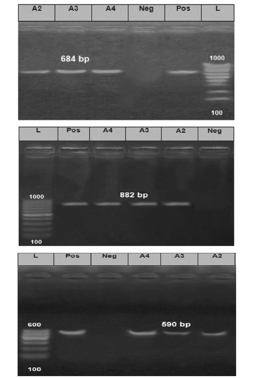 The Electrophoretic pattern of the RT- PCR products to the brain samples (Lab codes; A2, A3 and A4) on the gel electrophoresis (1.5%), Panel A; G gene (590 bp), Panel B; N gene (684bp) and Panel C; P gene (882 bp). Positive and negative controls are included.