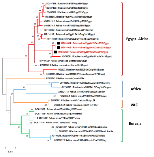 Phylogenetic tree using maximum likelihood method based on nucleoprotein (N) gene nucleotide sequences of our new RABV isolates from Elwadi- Elgedid (indicated by black squares) with other sequences of rabies viruses retrieved from the GenBank database. Numbers at the internal nodes represent the bootstrap probabilities (1000 replicates). The scale bar (0.01) means nucleotide changes or substitutions per site.