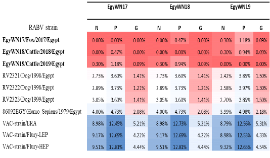 Pairwise distance percentages of the nucleotide sequences of N, P and G genes of the three new Egyptian isolates in relation to themselves and other Egyptian and vaccinal strains retrieved from the GenBank database. The highest related genes have a deep red color that converts to light red, light blue and deep blue with increasing distance