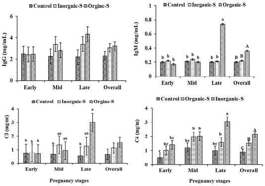 Changes of Changes in plasma (IgG, IgM) and immune complement (C3, C4) in Hassani goats fed a basic diet or a diet supplemented with inorganic or organic salts during different pregnancy stages under arid conditions.