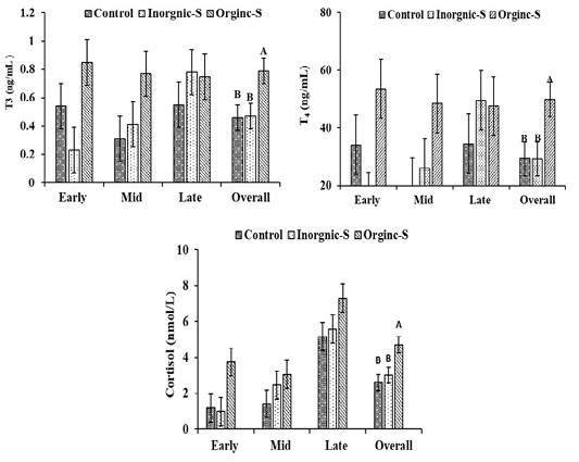 Changes of hormonal profiles in Hassani does fed a basic diet or a diet supplemented with inorganic or organic salts during different pregnancy stages under arid conditions. A-B Letters among the group differ significantly (P <0.05).