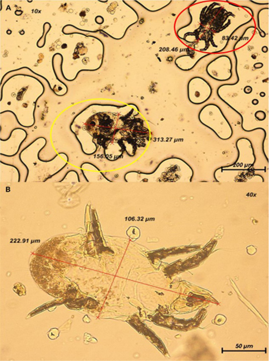 (A) Presence of two mites at 100x magnification. Yellow circle: Mite is oval-shaped with shorter III and IV limbs; Red circle: Mite is elongated in shape. (B) Closer view of mite with appearance of 4 pairs of segmented limbs at 400x magnification.
