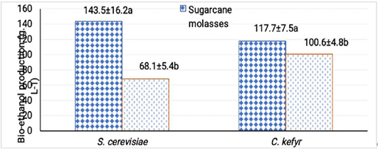 Effect of optimal conditions on bio-ethanol production by S. cerevisiae and C. kefyr using two kinds of molasses. Number followed by the same letter are not significantly different at P= 0.05 when compared by Duncan test.