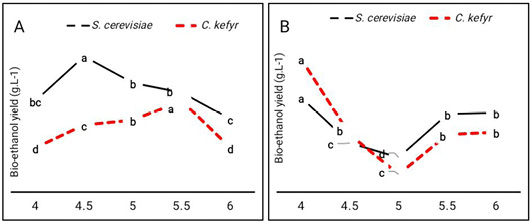 Effect of initial pH values on bio-ethanol production (g.L-1) by S. cerevisiae and C. kefyr using two kinds of molasses. (A) Sugarcane molasses (B) Sugar beet molasses Number followed by the same letter are not significantly different at P= 0.05 when compared by Duncan test.