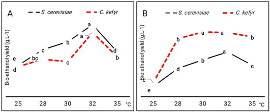 Effect of incubation temperature on bio-ethanol production (g.L-1) by S. cerevisiae and C. kefyr using two kinds of molasses. (A) Sugarcane molasses (B) Sugar beet molasses Number followed by the same letter are not significantly different at P= 0.05 when compared by Duncan test at P= 0.05 when compared by Duncan test.
