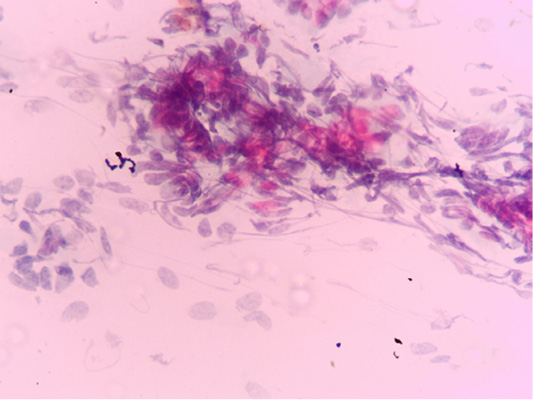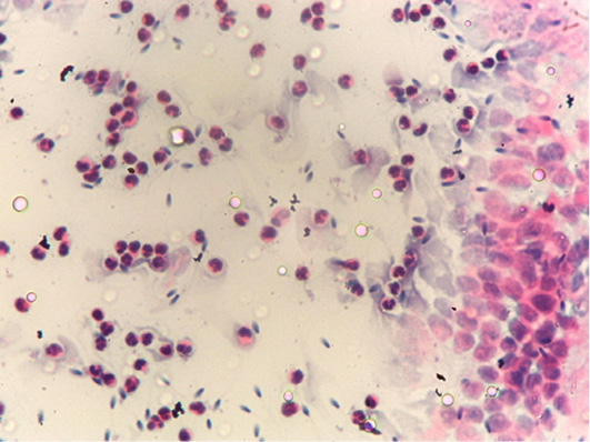 Postive endometrial cytology smear as a few endometrium epithelial cells was observed together with hypersegmented neutrophils.
