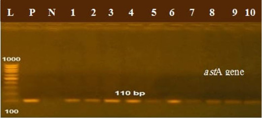 Lanes 1:10 positive amplification of astA gene at 110 bp P: positive control; N: negative control; L: DNA ladder.