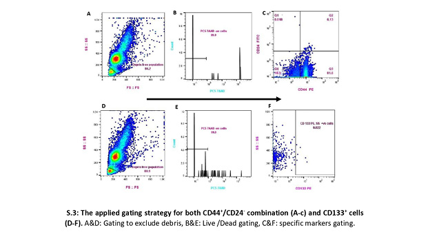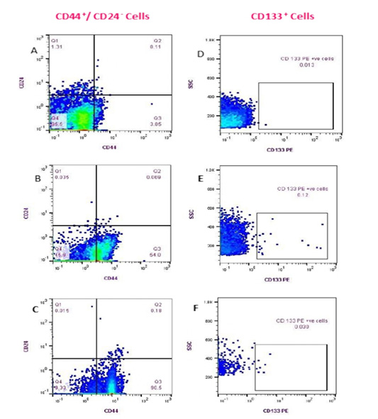 Flow cytometry detection of (CD44+/CD24- ) and CD133+ cell populations in Feline PB. (Fluorescence level of CD44 (PE) versus CD24 (FITC) (A-C)); Healthy cat (A), a diseased cat without lung metastasis (B) and diseased cat with lung metastasis (C). The data are representative of one cat in each animal group (GA, GB). Fluorescence level of CD133 (PE) versus cellular complexity (SS: SS) (D-F); Healthy cat (D), Diseased cat without lung metastasis (E), and diseased cat with lung metastasis (F).