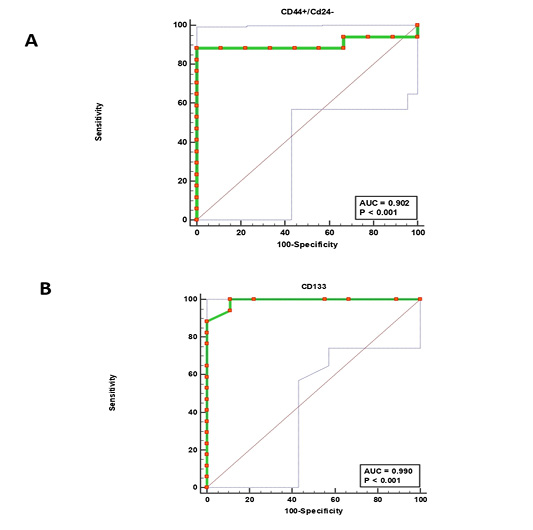 Receiver operating characteristic (ROC) curves. (CD44+/CD24-) cells (A) and CD133+ cells (B).