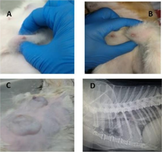Feline physical and radiographic examination. Physical and radiographic examination of diseased animals (A-D). Queens with different tumor sizes (A-C), and Queen with lung metastasis (D).