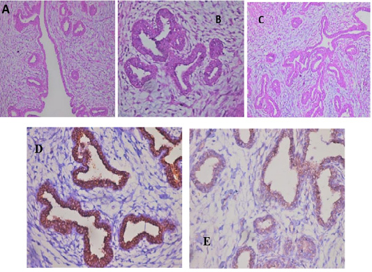 Feline mammary carcinoma. Representative pictures for H&E demonstrated hyperplasia of ductal epithelial with gland formation (A-C) (H&E: A, C X 200 & B X 400). Positive CD44 peroxidase reaction (brown color) in the cell membrane of lining epithelium (D) (CD44-peroxidase X 400). IHC showed a positive CD133 peroxidase reaction (brown color) in both cytoplasm and cell membrane of ductal lining epithelium (E) (CD133-peroxidase X 200).