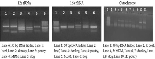 RFLP profile of mt. 12S rRNA, 16S rRNA and Cyt-b genes. PCR amplicons of pure samples used in the present study that subjected to HinfΙ restriction digestion.
