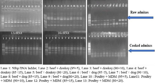 RFLP pattern of PCR Amplified mt. 12S rRNA, 16S rRNA and Cyt-b genes. Digested with restriction Enzyme ALul of raw and cooked admixed samples producing following restriction products.