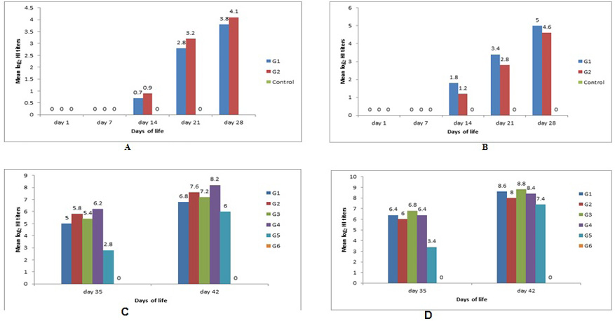 Geometric mean log2 of HI titers in experimental SPF chickens using two antigens, G1: vaccine 1 non challenged, G2: vaccine 2 non challenged, G3: vaccine 1 challenged, G4: vaccine 2 challenged, G5: challenged non vaccinated (Pos control), G6: non treated (Neg control). (A) HI test results using imported antigen: representing vaccine 2 seed virus from day 1 to day 28 before challenge, (B) HI test results using local antigen: Local antigen similar to vaccine 1 seed virus from day 1 to day 28 before challenge, (C) HI test results using imported antigen: representing vaccine 2 seed virus day 35 (1st week post challenge) and day 42 (2nd week post challenge), (D)HI test results using local antigen: Local antigen similar to vaccine 1 seed virus day 35 (1st week post challenge) and day 42 (2nd week post challenge).