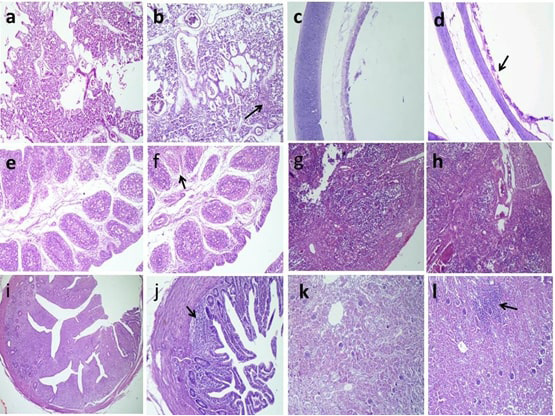 Histopathologic findings of chickens 5 days after challenge with AIV H9N2. a, Normal pulmonary tissues in G6; b, Interstitial pneumonia (arrow) in G5; c,Normal tracheal tissues in G6; d, Mild desquamated tracheal epithelium (arrow) in G5; e, Normal lymphoid follicles in G6; f, Necrotic some lymphoid follicles (arrow) in G5; g, Normal cortical and medullary lymphoid population in G6; h, congested blood vessels with thickening of septae in G5; i, normal lymphoid aggregations in G6; j, partial depletion (arrow) in G5; k, normal renal glomerular and tubular structure in G6; l, interstitial inflammatory cells infiltrations (arrow) in G5 H and E stain.