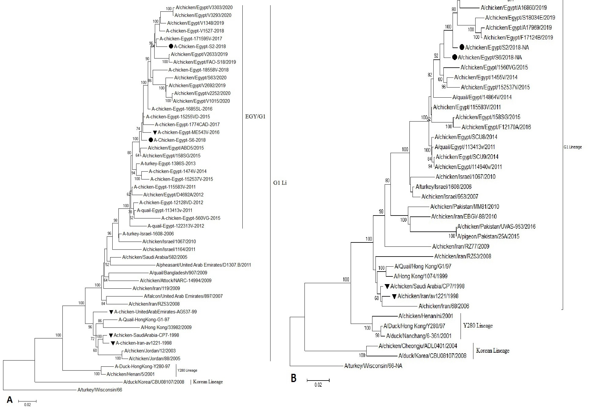 Phylogenetic analysis of H9 and N2 genes nucleotide sequences of AIV (S2andS6) isolates from Sharkia Province, Egypt and other sequences available in GenBank. (A) The tree was constructed via multiple alignments of 1465 bp nucleotide sequence of HA gene. (B) The tree was constructed via multiple alignments of 1265 bp of NA gene, using the neighbor-joining method and the Kimura-2-parameter models in MEGA7. Strain A/Turkey/Wisconsin/1966 was used as the root of the tree at 1000 bootstrap replicates. Isolates in this study are marked with solid circle. Vaccine seeds are marked triangle.