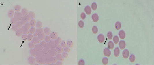 Morphological form of Theileria spp within RBC stained with Giemsa, examined under oil immersion lens (100X); A) Single and double pyriform, Round anaplasmoid shape; B) Maltese cross shape.