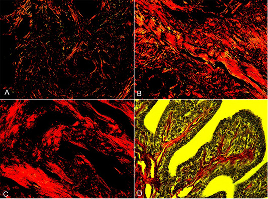 Collagen fibers in grades I, II, and III of the CMGCs (canine mammary gland carcinomas). A, CMGCs grade I, collagen fibers in the stroma appear with red-orange birefringence (Coll-I) and green birefringence (Coll-III). B, CMGCs grade II, a predominance of Coll-I fibers can observe. C, CMGCs grade III, note the formation of dense collagen bands of Coll-I. D, Collagen fibers in pedunculated papillary structures in CMGCs, under low polarized light. PSR staining. 200X.