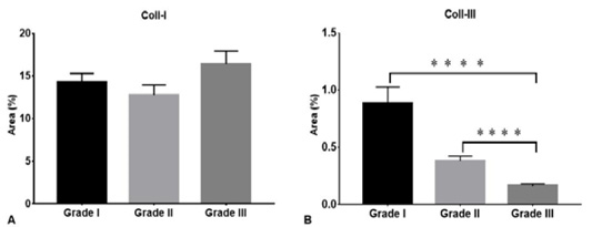 Density of collagen type I and III in three grades of CMGCs. Coll-I (Collagen type I), Coll-II (Collagen type III). **** P < 0.0001.