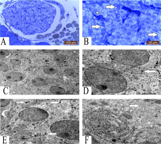 A: Photomicrograph showing semithin section of parathyroid gland of one year guinea pig. Methylene blue (100µm). B: Photomicrograph showing semithin section of parathyroid gland showing granulated (star), vacuolated (arrows) chief cells and blood capillaries (C). Methylene blue (20µm). C: TEM of mature parathyroid gland showing several chief cells with different organelles 5 μm. D: TEM of mature parathyroid gland showing tortuous plasma membrane (arrow) of chief cells 2 μm. E: TEM of chief cells contain RER (R), mitochondria (m) and secretory granules (arrows) 2 μm. F: TEM of chief cells contain concentric RER (R) and Golgi complex (arrow) 1 μm.