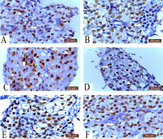 A: Photomicrograph of parathyroid gland of 60 ED showing negative nuclear reaction of few cells, strong nuclear reaction of some cells (arrowhead) and weak reaction of others (arrow) PCNA (20µm). B: Photomicrograph of parathyroid gland of 60 ED Guinea pig showing few cells give negative nuclear reaction (arrow) and most of cells show positive nuclear reaction (arrowhead) Ki-67 (20µm). C: Photomicrograph of parathyroid gland of 1 month showing strong nuclear reaction of some cells (arrow) and weak reaction of others (arrowhead) PCNA (20µm). D: Photomicrograph of parathyroid gland of 1 month Guinea pig showing strong (arrow) and weak (arrowhead) positive nuclear reaction Ki-67 (20µm). E: Photomicrograph of parathyroid gland of 12 months Guinea pig showing few negative (arrow) and most positive nuclear reaction (arrowhead) Ki-67 (20µm). F: Photomicrograph of parathyroid gland of 12 months showing strong nuclear reaction of most of cells (arrow head) and weak reaction of few cells (Arrow) PCNA (20µm).